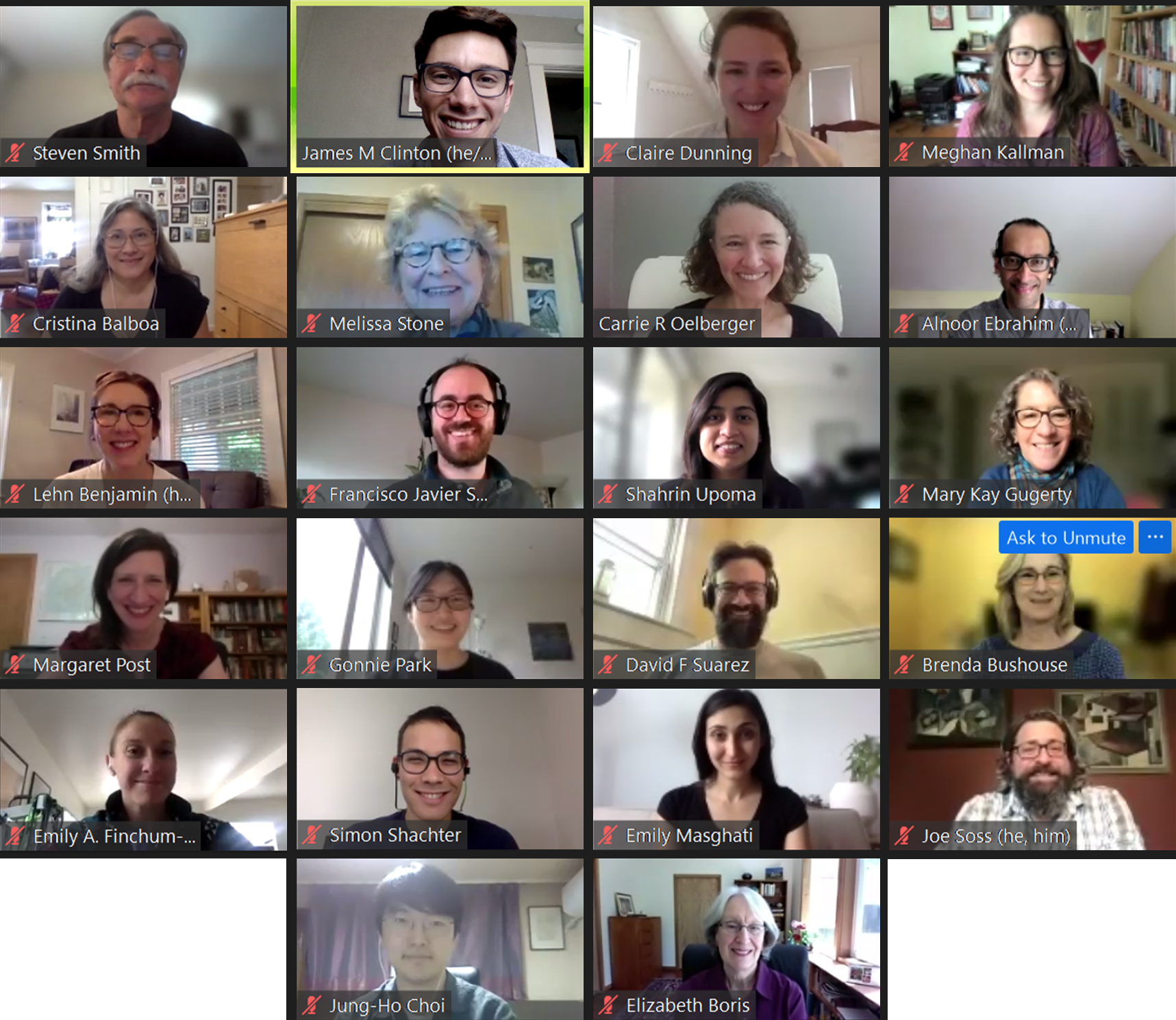 When the pandemic showed no signs of slowing, even a full year later, we made the decision to move our workshop online. The benefit, of course, was that we were able to include twenty-five participants, from a broader array of geographic locations. We were delighted that the participants overwhelmingly felt we had succeeded in replicating the spirit of the workshop in an online format. While we would have enjoyed gathering in shorts and t-shirts over BBQ and gone for meandering walks with one another, we were able to create a workshop culture that was casual yet rigorous, while becoming more inclusive and accessible than we would have been able to do if we were holding the workshop in person. We called it the “public-private tensions” workshop and encouraged participation from those interested in the dynamics between public and private domains, broadly construed. The inaugural planning committee consisted of Carrie Oelberger (University of Minnesota), Mary Kay Gugerty (University of Washington), Melissa Stone (University of Minnesota), and James Clinton (University of Minnesota).